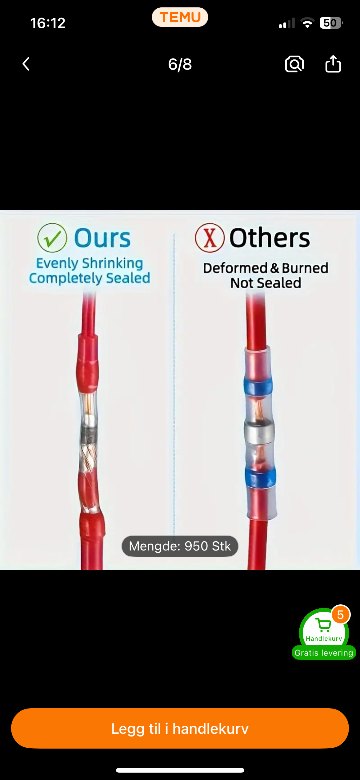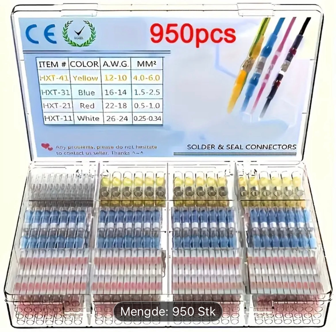 Dette settet inneholder 950 stk loddefrie kabelskjøter med tinn og krympemuffer i 4 forskjellige størrelser og farger (gul, blå, rød og hvit). Perfekt for elektriske reparasjoner innen bil, båt, MC, solcelleanlegg, og hobbyprosjekter.